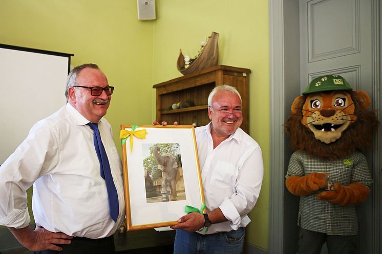 Wolfgang Welter (Krostitzer Brauerei) und Prof. Jörg Junhold (Zoo Leipzig GmbH) freuen sich auf die weitere Zusammenarbeit