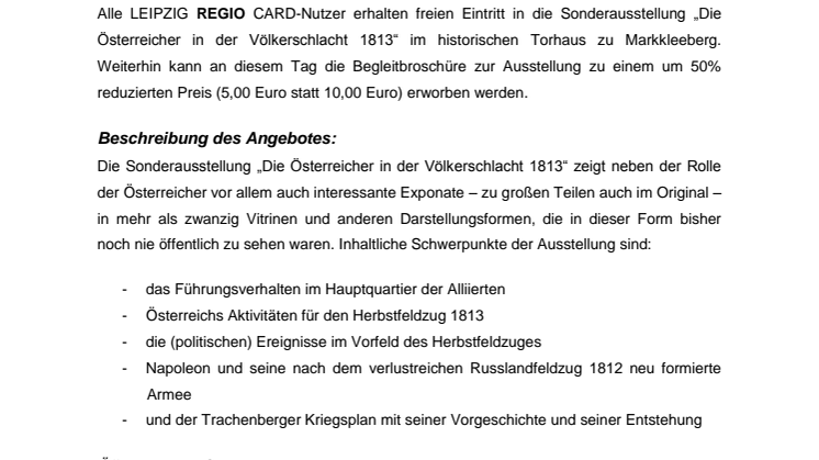 Am Sonntag den 25. Mai 2014 erhalten dann alle LEIPZIG REGIO CARD-Nutzer in der Zeit von 14:00 bis 17:00 Uhr kostenfreien Eintritt in die Sonderausstellung „Die Österreicher in der Völkerschlacht 1813“ im historischen Torhaus zu Markkleeberg. Weiterhin kann an diesem Tag die Begleitbroschüre zur Ausstellung zu einem um 50% reduzierten Preis (5,00 Euro statt 10,00 Euro) erworben werden.