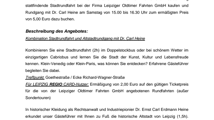 Die Aktion startet am Samstag den 24. Mai 2014. Alle Besitzer einer gültigen LEIPZIG REGIO CARD, die am 24. Mai 2014 bei der Leipziger Oldtimer Fahrten GmbH ein Ticket für eine am selben Tag stattfindende Stadtrundfahrt kaufen, können einen Rundgang mit Dr. Carl Heine von 15:00 bis 16:30 Uhr zum ermäßigten Preis von 5,00 Euro dazu buchen und somit die Leipziger Innenstadt bei einer wissenswerten und amüsanten Stadtführung erkunden.