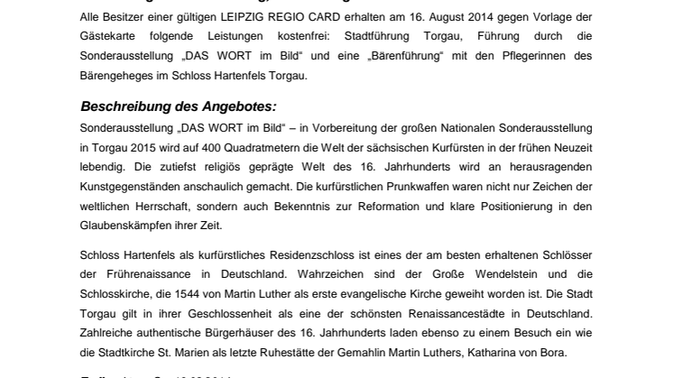 Alle Besitzer einer gültigen LEIPZIG REGIO CARD haben am Aktionstag, den 16. August 2014, die einmalige Möglichkeit, kostenfrei an einer Führung durch die Sonderausstellung „DAS WORT im Bild“ im Schloss Hartenfels Torgau teilzunehmen. Die Führung beginnt um 15.00 Uhr. Treffpunkt ist der Innenhof des Schlosses. Weiterhin kostenfrei sind am selben Tag, gegen Vorlage der LEIPZIG REGIO CARD, die Teilnahme an einer Stadtführung durch Torgau (14.00 Uhr, Treff: Tourist-Information) und eine „Bärenführung“ mit den Pflegerinnen des Bärengeheges im Schloss Hartenfels (16.00 Uhr, Treff: Innenhof des Schlosses).