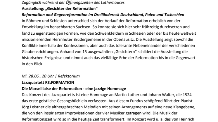In der Kapelle in Wittenberg wird die Ausstellung "Gesichter der Reformation" zu sehen sein, die sich mit Reformation und Gegenreformation im Dreiländereck Deutschland, Polen und Tschechien beschäftigt. Das Jazzquartett "RE:FORMATION" tritt am Mittwochabend um 20 Uhr im Refektorium auf. Das Konzert des Jazzquartetts ist eine Hommage an Martin Luther und Johann Walter, die 1524 das erste geistliche Gesangsbüchlein verfassten. Am Mittwoch, Donnerstag und Freitag jeweils um 18 Uhr wird es theatralisch im Amphietheater: Der Großinquisitor - Dostojewski in der Fassung der TheaterschaffT. Mit Tiefe, aber auch mit komödiantischer Distanz bewegt sich das Ensemble im Sog des Textes und ringt zugleich mit seiner persönlichen Situation und der allgemeinen Weltlage im Jahr 2017. Zwei weitere musikalische Highlights sind zum einen das Konzert des Jungen Mitteldeutschen Barockensembles, denn auch Komponisten waren Boten der Reformation. Und zum anderen erklingt am Freitag, dem 30. Juni 2017 "BACH in JAZZ" vom Stephan König Jazz-Trio & Tenor Martin Petzold.