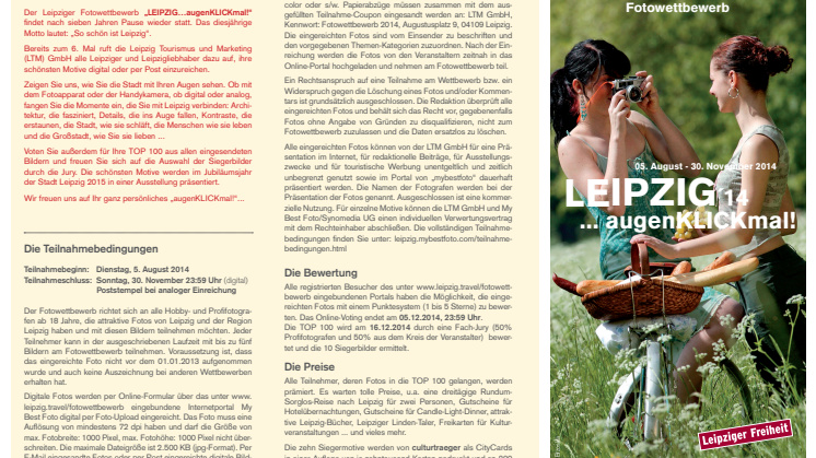 Weitere Informationen zu „LEIPZIG …augenKLICKmal!‘14“ sowie die Teilnahmebedingungen gibt es unter www.leipzig.travel/fotowettbewerb. Des Weiteren gibt es das Prospekt zum Fotowettbewerb mit dem Teilnahme-Coupon in der angefügten PDF-Datei zum Download.