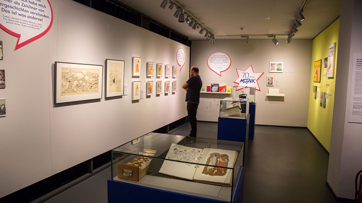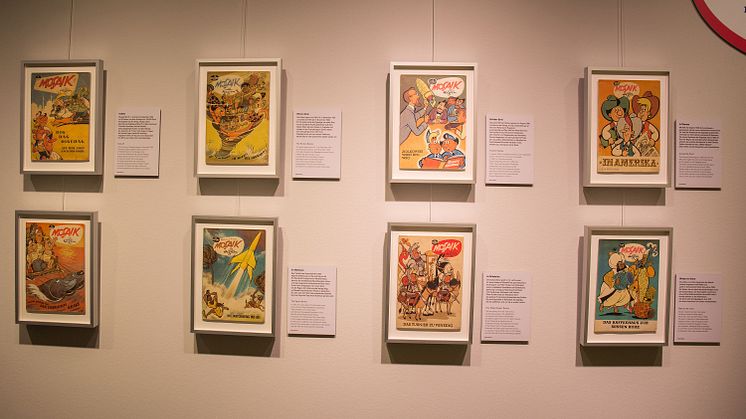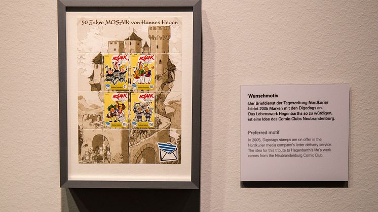Ein besonderes Augenmerk der kompakten Ausstellung liegt auf Hannes Hegens Lebensweg, einer Ausnahmebiografie in der DDR. Trotz politischer Vorgaben gelang es dem Grafiker und Zeichner, über zwei Jahrzehnte hinweg mit dem Mosaik inhaltlich und wirtschaftlich weitgehend unabhängig zu bleiben – ein seltenes Beispiel für kreativen Freiraum im Sozialismus. Die Ausstellung beleuchtet Hegens künstlerische Anfänge ab Studienbeginn 1947 in Leipzig, die Hochphase seines Erfolgs ab 1955 zusammen mit dem Mosaik-Kollektiv und seinen Rückzug ins Private nach dem Bruch mit dem FDJ-Verlag Junge Welt und seinem Team 1975.