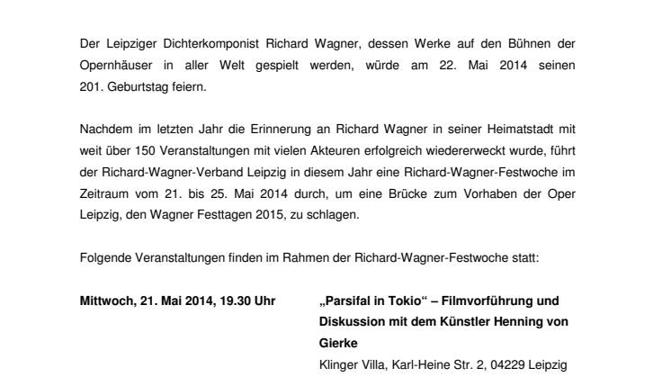 Nachdem im letzten Jahr die Erinnerung an Richard Wagner in seiner Heimatstadt mit weit über 150 Veranstaltungen mit vielen Akteuren erfolgreich wiedererweckt wurde, führt der Richard-Wagner Verband Leipzig e.V. in diesem Jahr eine Richard-Wagner-Festwoche im Zeitraum vom 21. bis 25. Mai 2014 durch, um eine Brücke zum Vorhaben der Oper Leipzig, den Wagner Festtagen 2015, zu schlagen.