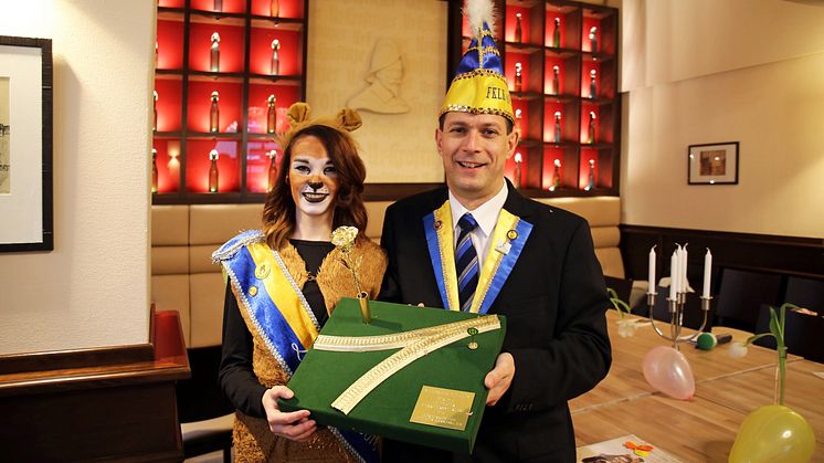 Löwin LEILA (alias Julia Liebner von Ur-Krostitzer) und Steffen Hoffmann (Präsident des Förderkomitee Leipziger Karneval) präsentieren die „GOLDENE ROSE“