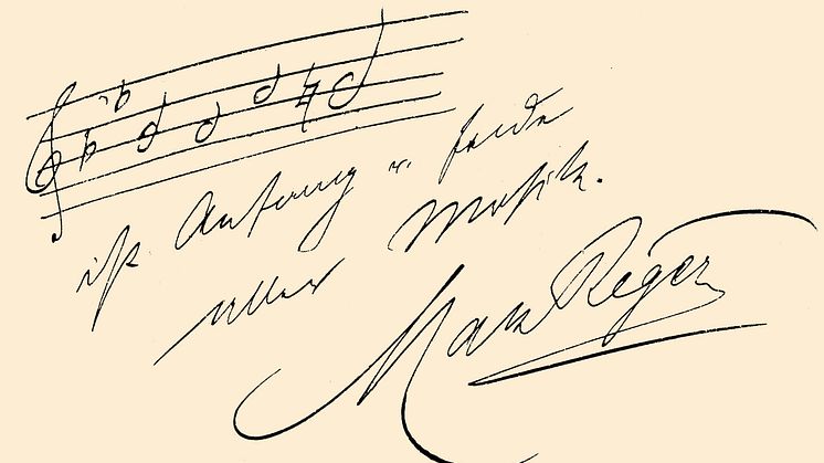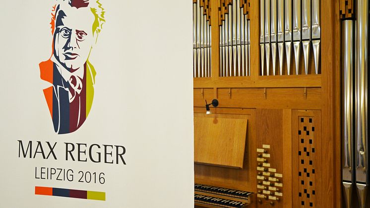 Logo "Max Reger Festjahr 2016" vor der Orgel im Kammermusiksaal der HMT Leipzig