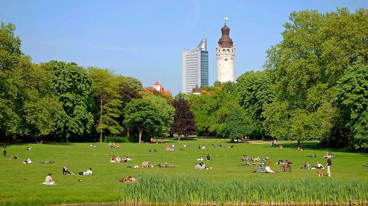 Johannapark mit Blick auf das Neue Rathaus und das City-Hochhaus