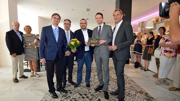 Die Repräsentanten der DEHOGA überreichen die Vier-Sterne-Klassifizierung an Hoteldirektor Robert Bauer