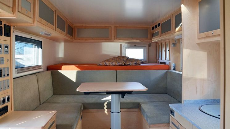 • Die Inneneinrichtung des Weltreisemobils, welches auf der "Touristik & Caravaning" 2016 auf der Leipziger Messe ausgestellt wird