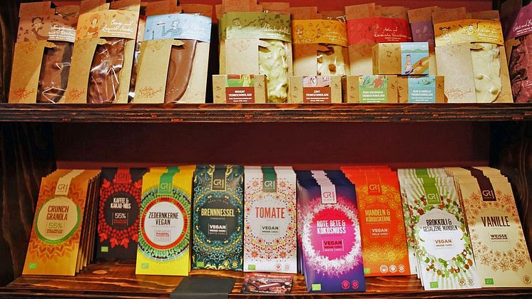 Das Sortiment des Schokoladenfachgeschäftes "Wein & Schokolade" umfasst hochwertige Schokoladen aus Edelkakaosorten