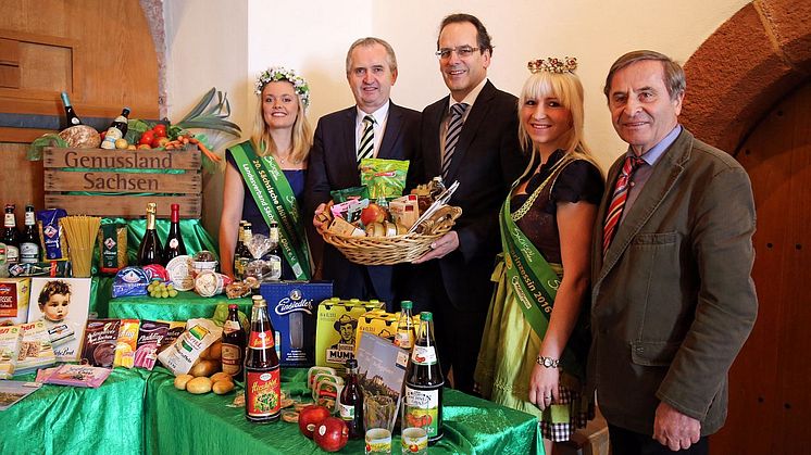 Grüne Woche: Sachsens Landwirtschaftsminister Thomas Schmidt (2.v.l.), Volker Bremer, Geschäftsführer der LTM GmbH und Dr. Manfred Graetz, Vorsitzender des TV SBuHL e.V. (r.) präsentieren sächsische Aussteller