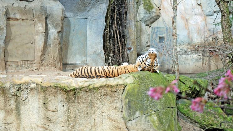 Amurtiger Tomak, Vater der jungen Zwillinge, macht ein Mittagsschläfchen im Zoo Leipzig