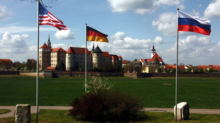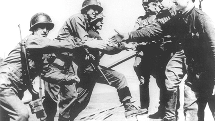 • Historisches Foto der Begegnung an der Elbe bei Torgau im April 1945