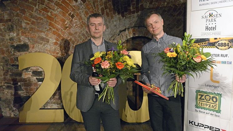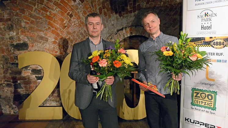 Danksagung der LTM GmbH an: v.l. Mario Wolf (Moritzbastei) und Adrian Neumann (Naturton GmbH)