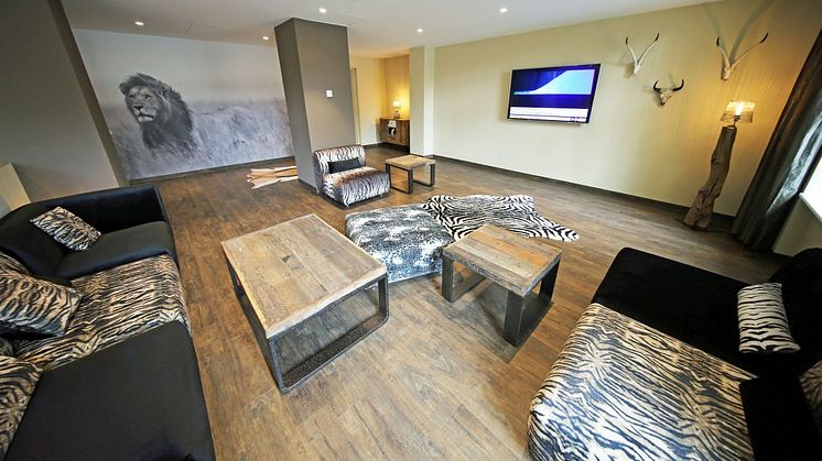 Couchlandschaft im Retro-Look und mit Fischer-Art verzierte Säulen