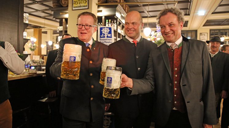 ​O’ zapft is! So heißt es jetzt regelmäßig im Herzen Leipzigs. Münchens älteste Brauerei, die 1328 gegründete Augustiner-Bräu KG, schenkt an Leipzigs bester Adresse, direkt am Markt, ihr Bier aus. Hunderte Ehrengäste drängten sich am 8. März 2018 rund um den ersten Fassanstich, der vom Berliner Promi-Wirt Josef Laggner ("Lutter & Wegner“) vorgenommen wurde.
