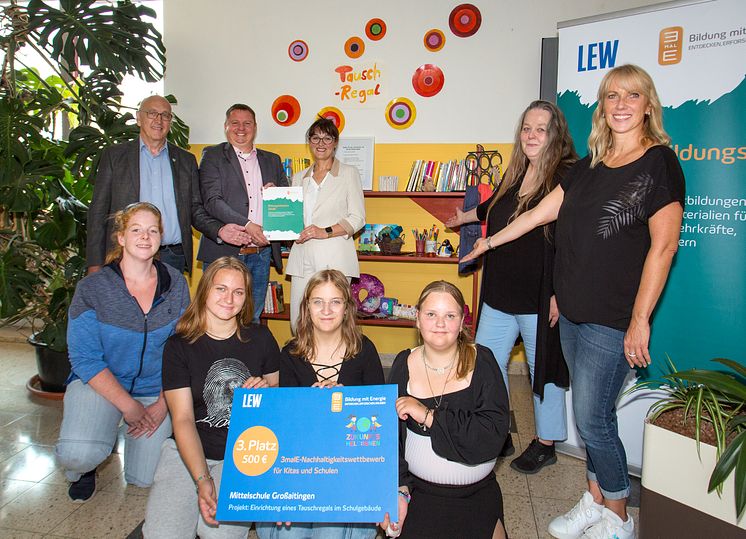 Preisverleihung Zukunftsheld:innen: Im Beisein von Großaitingens Bürgermeister Erwin Goßner (ganz links) übergab Michael Smischek von LEW (2.v.l) Schulleiterin Bosa Rieder (3.v.l.), Sozialpädagogin Nadja Fuchs-Meerkamp (2.v.r.), Alexandra Geißler vom Elternbeirat (r.) und Schülerinnen der Umwelt AG den symbolischen Scheck über 500 Euro für den 3.Platz beim 3malE-Nachhaltigkeitswettbewerb Zukunftsheld:innen mit Ihrem Projekt „Tauschregal“.