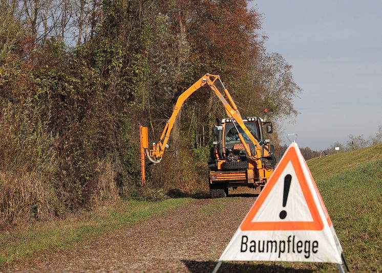 Maschine schneidet Gehölz. Hinweisschild zur Baumpflege