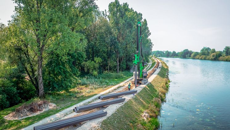 Rammarbeiten einer Spundwandramme bei Dammsanierungsarbeiten in Feldheim 2018