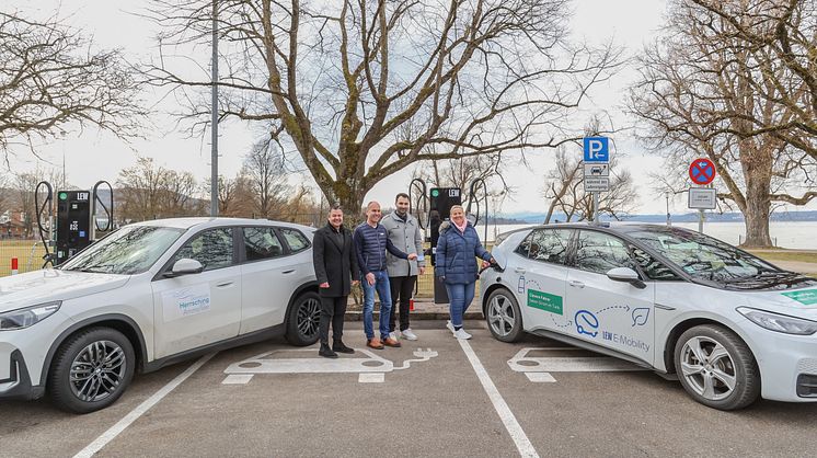Von links: Bauamtsleiter Oliver Gerweck, Andreas Bayer und Rossen Schechredski (LEW) und 2. Bürgermeisterin Christina Reich vor den neuen Ladestationen auf dem Parkplatz an der Rieder Straße