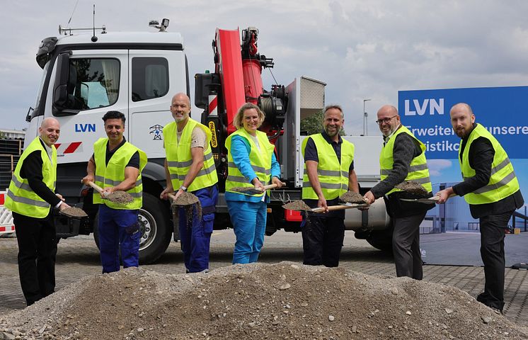 Spatenstich Logistikcenter Augsburg; Personen v.l.: Felix Dannecker (Architekturbüro Münzenmaier), Birol Uslu (Leiter Logistikcenter LVN) , Christian Barr (Vorstand Lechwerke AG), Eva Weber (Oberbürgermeisterin Stadt Augsburg), Norbert Wiedemann (Geschäftsführer LVN), Erwin Dittenhauser (Zech Bau), Moritz Münzenmaier (Architekturbüro Münzenmaier)