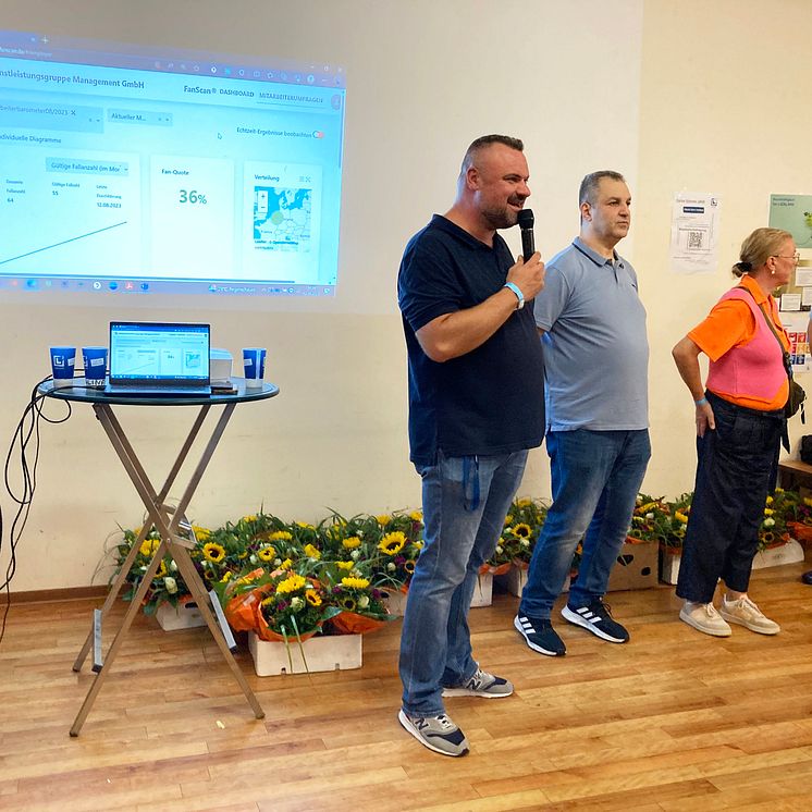 Um die Kolleginnen und Kollegen an den NRW-Standorten mit dem Instrument der kontinuierlichen und anonymen Mitarbeiterbefragung vertraut zu machen, haben wir beim Sommerfest am 12.08. in Dortmund eine Live-Befragung getestet und die Auswertung der Ergebnisse in Echtzeit an die Wand projiziert.