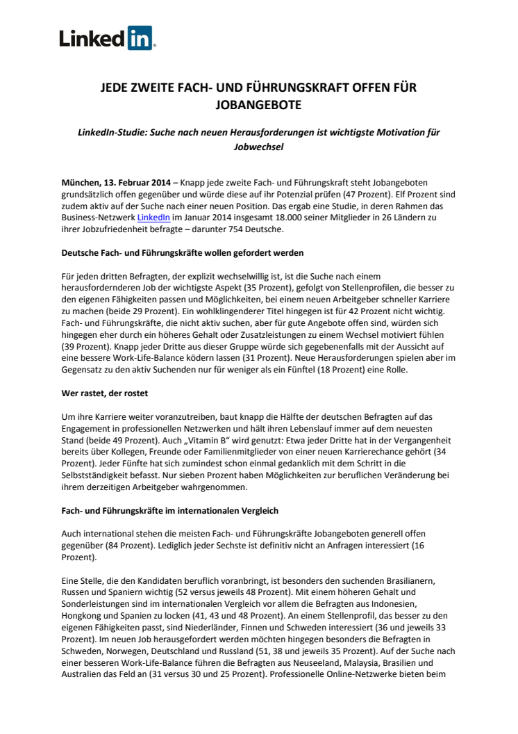 Knapp jede zweite Fach- und Führungskraft steht Jobangeboten grundsätzlich offen gegenüber und würde diese auf ihr Potenzial prüfen. Elf Prozent sind zudem aktiv auf der Suche nach einer neuen Position. Das ergab eine Studie, in deren Rahmen das Business-Netzwerk LinkedIn im Januar 2014 insgesamt 18.000 seiner Mitglieder in 26 Ländern zu ihrer Jobzufriedenheit befragte – darunter 754 Deutsche.