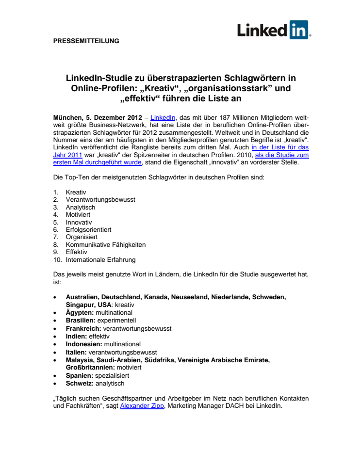 LinkedIn hat eine Liste der in beruflichen Online-Profilen überstrapazierten Schlagwörter für 2012 zusammengestellt. Weltweit und in Deutschland die Nummer eins der am häufigsten in den Mitgliederprofilen genutzten Begriffe ist „kreativ“. LinkedIn veröffentlicht die Rangliste bereits zum dritten Mal. Auch in der Liste für das Jahr 2011 war „kreativ“ der Spitzenreiter in deutschen Profilen.