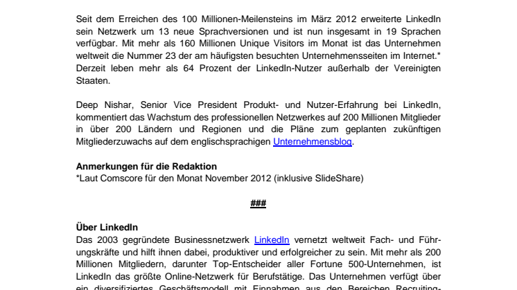Seit dem Erreichen des 100 Millionen-Meilensteins im März 2012 erweiterte LinkedIn sein Netzwerk um 13 neue Sprachversionen und ist nun insgesamt in 19 Sprachen verfügbar. Mit mehr als 160 Millionen Unique Visitors im Monat ist das Unternehmen weltweit die Nummer 23 der am häufigsten besuchten Unternehmensseiten im Internet.* Derzeit leben mehr als 64 Prozent der LinkedIn-Nutzer außerhalb der Vereinigten Staaten.
