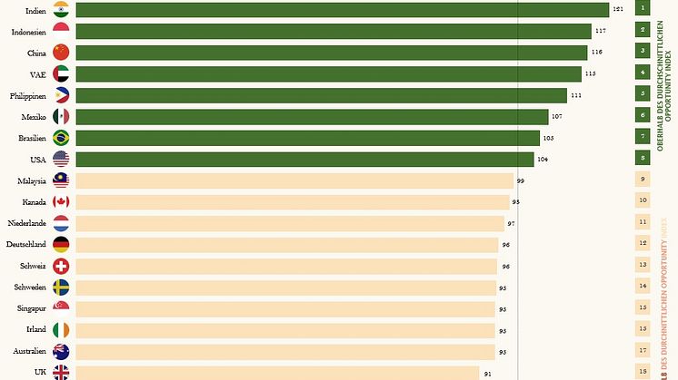 Während Deutsche und Schweizer auf dem gemeinsamen Rang zwei (von neun untersuchten europäischen Märkten) ihre beruflichen und privaten Möglichkeiten mit 96 Punkten noch verhältnismäßig optimistisch einschätzen (globaler Index = 100), ist die Skepsis in Italien und Frankreich sehr viel ausgeprägter. Schweden, Irland, Großbritannien und Spanien liegen im europäischen Vergleich im Mittelfeld, die Niederlande stehen an der Spitze. Eine Ausnahme unter den etablierten Industrienationen sind die USA, wo weiterhin großer Optimismus herrscht. An der Spitze der Gesamtauswertung stehen Indien, Indonesien und China.