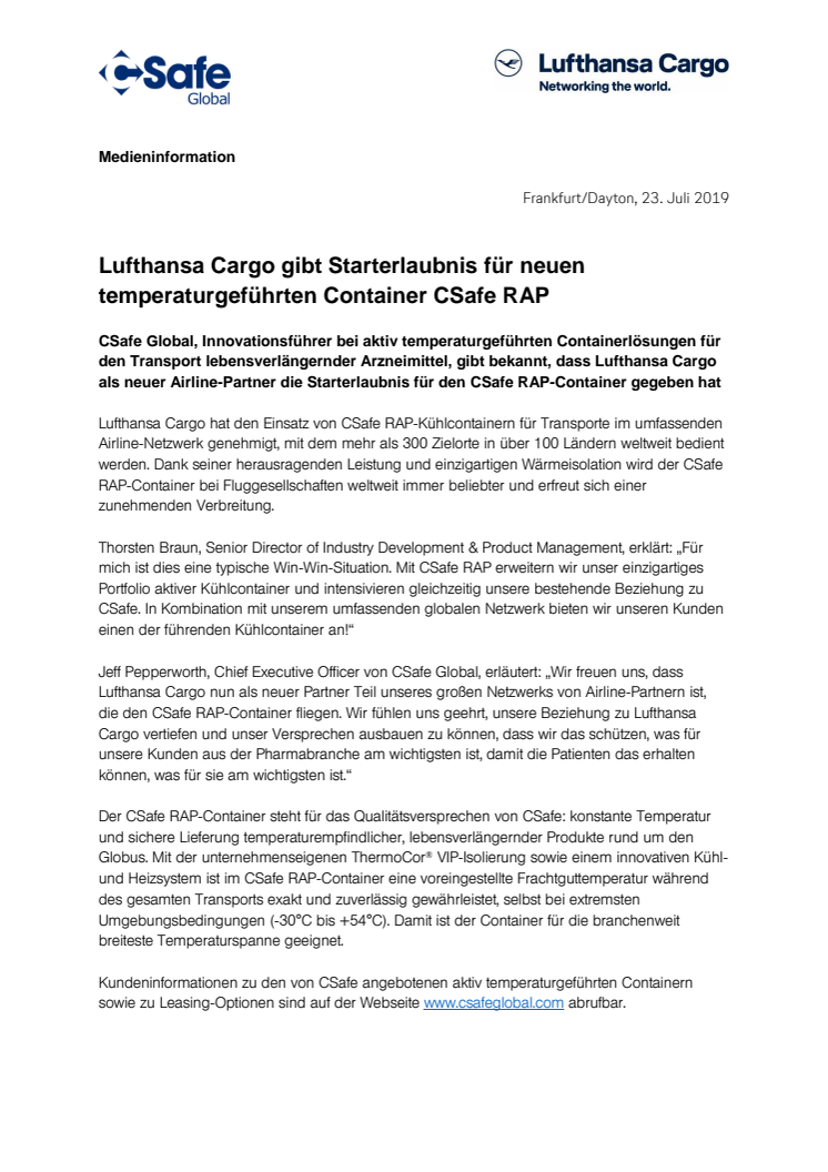 CSafe Global, Innovationsführer bei aktiv temperaturgeführten Containerlösungen für den Transport lebensverlängernder Arzneimittel, gibt bekannt, dass Lufthansa Cargo als neuer Airline-Partner die Starterlaubnis für den CSafe RAP-Container gegeben hat