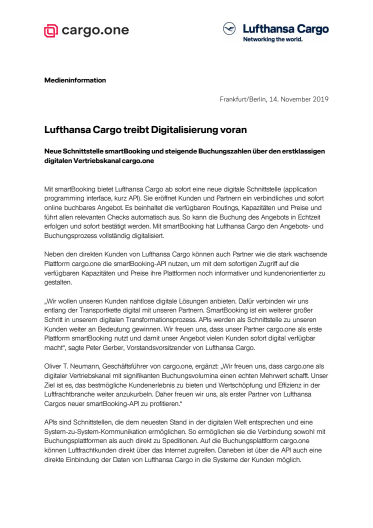 Neue Schnittstelle smartBooking und steigende Buchungszahlen über den erstklassigen digitalen Vertriebskanal cargo.one