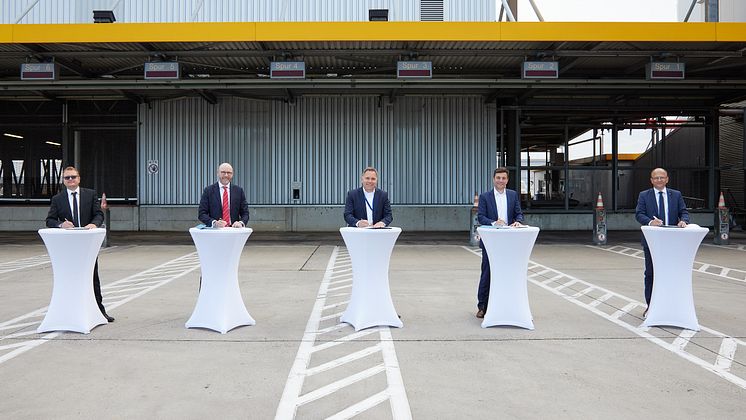 Vertragsunterzeichnung: (v.l.n.r) Mark Aberle, Senior Vice President Contracting and Legal Affairs Körber Supply Chain Automation, Dirk Hejnal, CEO Business Area Körber Supply Chain, Harald Gloy, COO Lufthansa Cargo, Gunnar Löhr, Head of Supply Management & Infrastructure Lufthansa Cargo, Hans-Jörg Vollert, CEO Vollert Anlagenbau