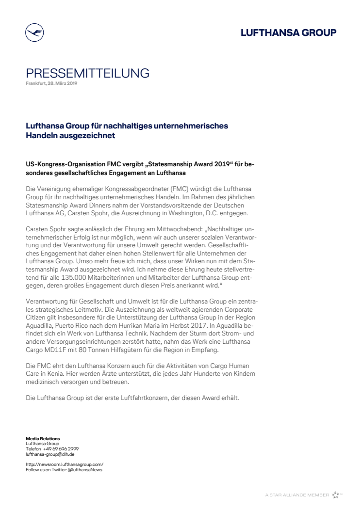 US-Kongress-Organisation FMC vergibt „Statesmanship Award 2019“ für besonderes gesellschaftliches Engagement an Lufthansa