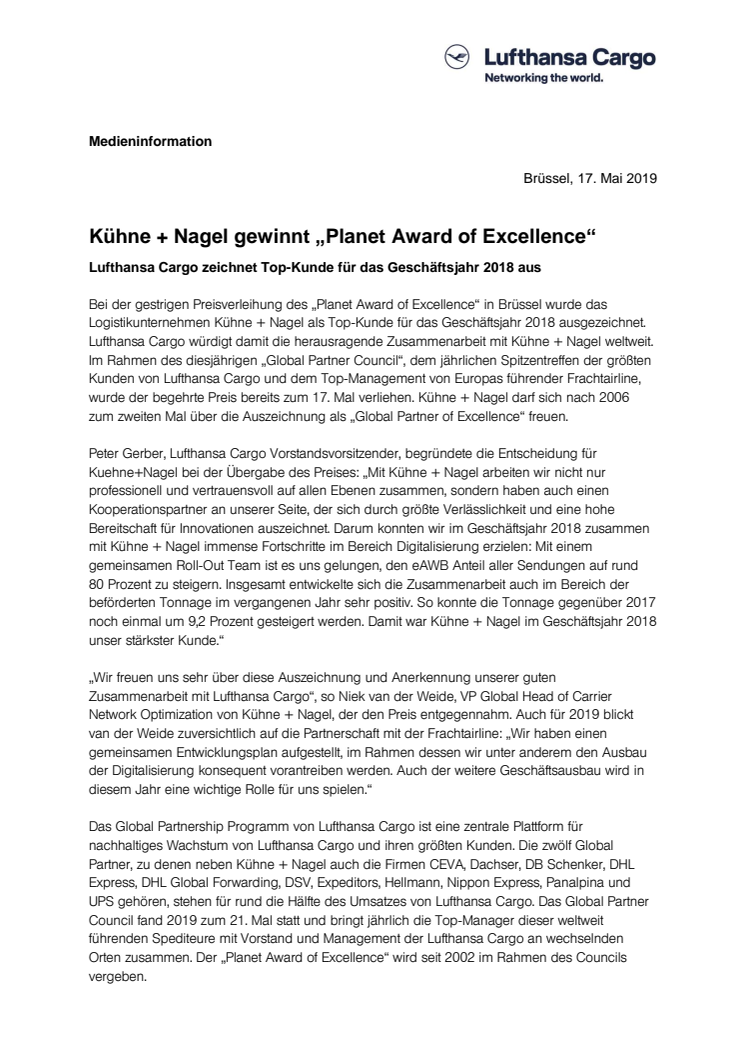 Bei der gestrigen Preisverleihung des „Planet Award of Excellence" in Brüssel wurde das Logistikunternehmen Kühne + Nagel als Top-Kunde für das Geschäftsjahr 2018 ausgezeichnet. Lufthansa Cargo würdigt damit die herausragende Zusammenarbeit mit Kühne + Nagel weltweit. Im Rahmen des diesjährigen „Global Partner Council", dem jährlichen Spitzentreffen der größten Kunden von Lufthansa Cargo und dem Top-Management von Europas führender Frachtairline, wurde der begehrte Preis bereits zum 17. Mal verliehen. Kühne + Nagel darf sich nach 2006 zum zweiten Mal über die Auszeichnung als „Global Partner of Excellence" freuen.