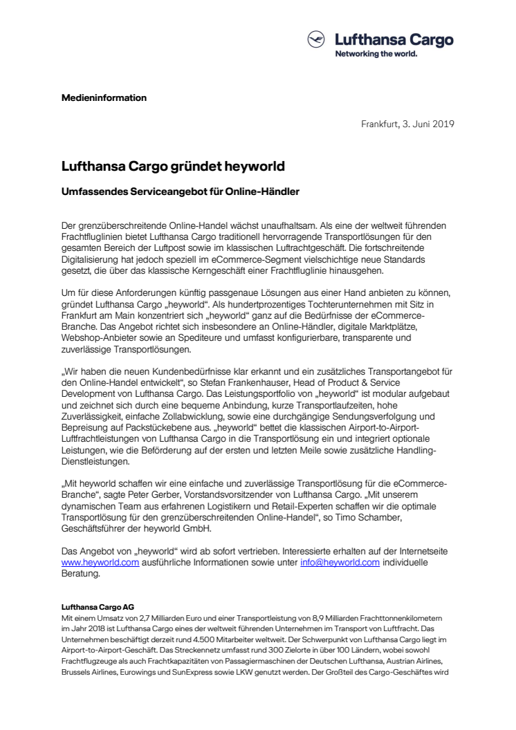 Um für diese Anforderungen künftig passgenaue Lösungen aus einer Hand anbieten zu können, gründet Lufthansa Cargo „heyworld“. Als hundertprozentiges Tochterunternehmen mit Sitz in Frankfurt am Main konzentriert sich „heyworld“ ganz auf die Bedürfnisse der eCommerce-Branche. Das Angebot richtet sich insbesondere an Online-Händler, digitale Marktplätze, Webshop-Anbieter sowie an Spediteure und umfasst konfigurierbare, transparente und zuverlässige Transportlösungen.