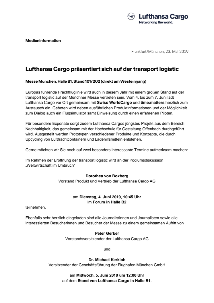 am Mittwoch, 5. Juni 2019 um 12:00 Uhr auf dem Stand von Lufthansa Cargo in Halle B1.