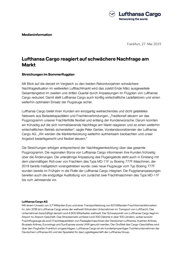Mit Blick auf die derzeit im Vergleich zu den beiden Rekordvorjahren schwächere Nachfragesituation im weltweiten Luftfrachtmarkt wird das zuletzt Ende März ausgeweitete Gesamtangebot im zweiten und dritten Quartal durch Anpassungen im Flugplan von Lufthansa Cargo reduziert. Damit stellt Lufthansa Cargo auch künftig wirtschaftliche Ladefaktoren und einen weiterhin optimalen Einsatz der Flugzeuge sicher.