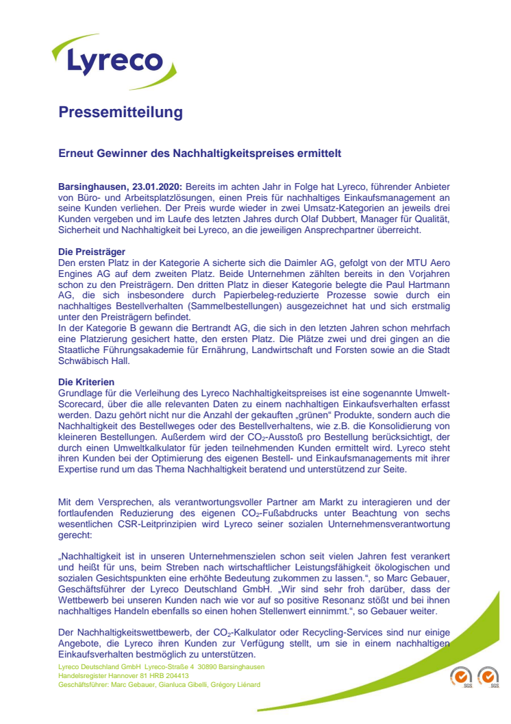 „Nachhaltigkeit ist in unseren Unternehmenszielen schon seit vielen Jahren fest verankert und heißt für uns, beim Streben nach wirtschaftlicher Leistungsfähigkeit ökologischen und sozialen Gesichtspunkten eine erhöhte Bedeutung zukommen zu lassen.“, so Marc Gebauer, Geschäftsführer der Lyreco Deutschland GmbH. „Wir sind sehr froh darüber, dass der Wettbewerb bei unseren Kunden nach wie vor auf so positive Resonanz stößt und bei ihnen nachhaltiges Handeln ebenfalls so einen hohen Stellenwert einnimmt.“, so Gebauer weiter.