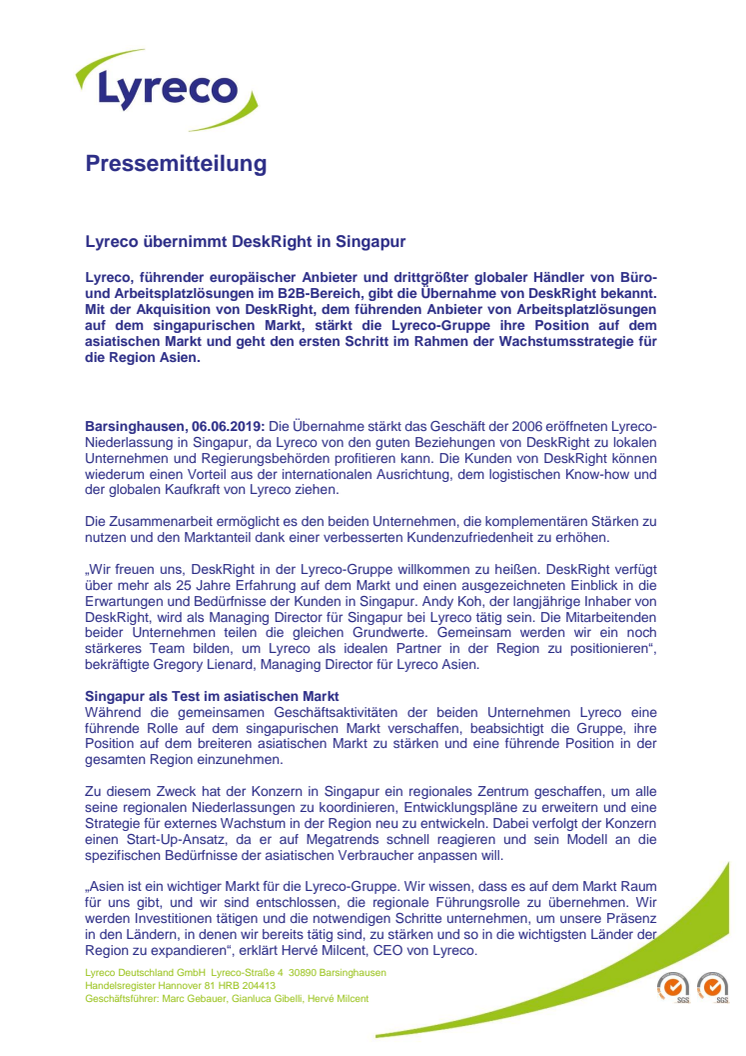 Barsinghausen, 06.06.2019: Die Übernahme stärkt das Geschäft der 2006 eröffneten Lyreco-Niederlassung in Singapur, da Lyreco von den guten Beziehungen von DeskRight zu lokalen Unternehmen und Regierungsbehörden profitieren kann. Die Kunden von DeskRight können wiederum einen Vorteil aus der internationalen Ausrichtung, dem logistischen Know-how und der globalen Kaufkraft von Lyreco ziehen.