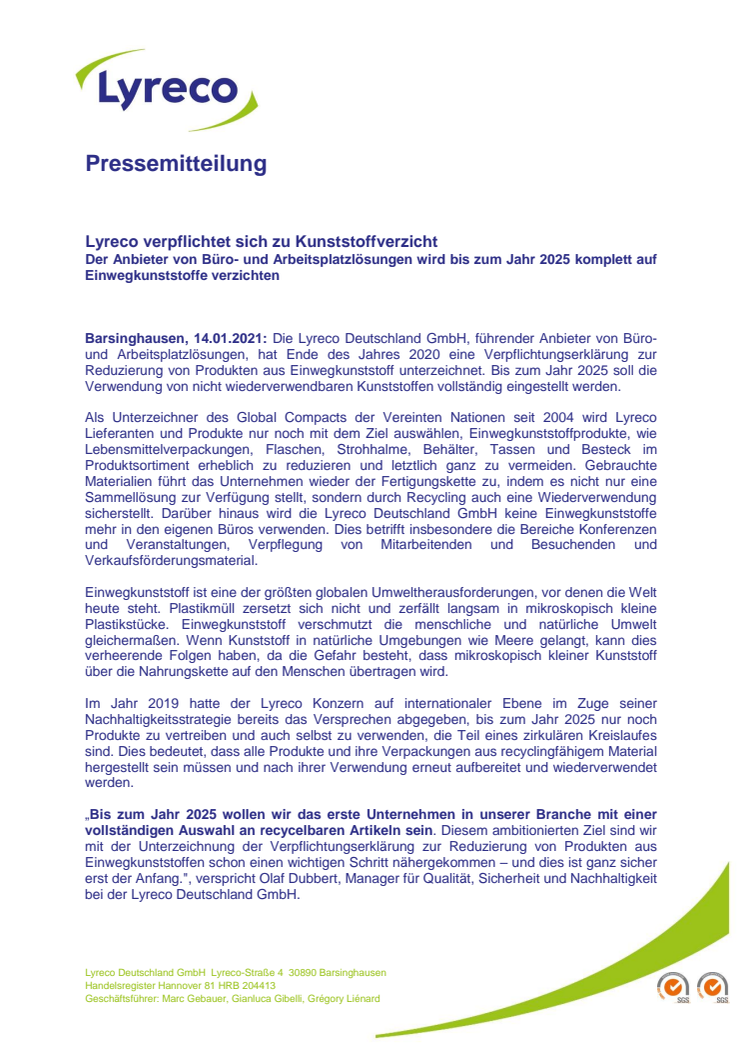 Die Lyreco Deutschland GmbH, führender Anbieter von Büro- und Arbeitsplatzlösungen, hat Ende des Jahres 2020 eine Verpflichtungserklärung zur Reduzierung von Produkten aus Einwegkunststoff unterzeichnet. Bis zum Jahr 2025 soll die Verwendung von nicht wiederverwendbaren Kunststoffen vollständig eingestellt werden.