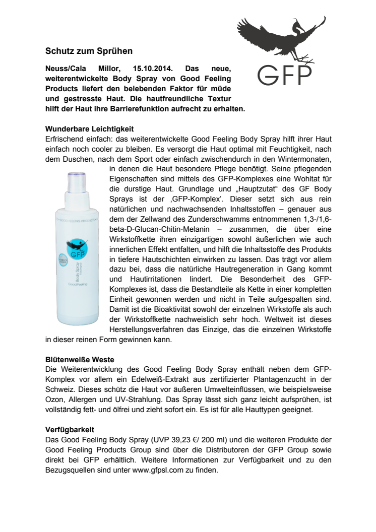Erfrischend einfach: das weiterentwickelte Good Feeling Body Spray hilft ihrer Haut einfach noch cooler zu bleiben. Es versorgt die Haut optimal mit Feuchtigkeit, nach dem Duschen, nach dem Sport oder einfach zwischendurch in den Wintermonaten, in denen die Haut besondere Pflege benötigt.
