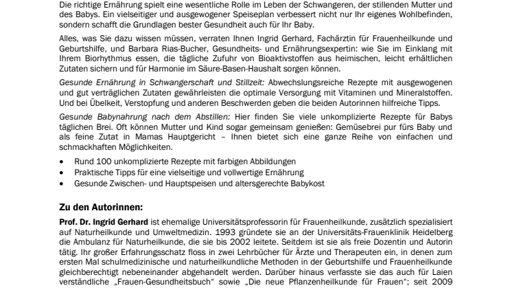 Die Frauenärztin Prof. Dr. Ingrid Gerhard und die Ernährungsexpertin Dr. Barbara Rias-Bucher stellen in ihrem Ratgeber ein ganzheitliches Ernährungskonzept vor, das Mütter während der Schwangerschaft mit allem versorgt, was diese für ihr Wohlbefinden und für die Entwicklung des Kindes brauchen. Dabei wird dem Kind von Beginn an eine Lebensweise „in die Wiege gelegt“, die den individuellen Biorhythmus als Teil der natürlichen Abläufe begreift.