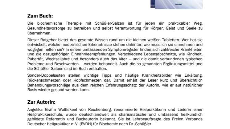 Neben dem umfangreichen Schüßler-Standardwerk und dem praktischen Kompakt-Ratgeber bietet das neue Taschenbuch "Die 12 Salze des Lebens" von Angelika Gräfin Wolffskeel von Reichenberg zusätzlich wertvolle Tipps für die Ernährung sowie zur Anwendung bei typischen Alltagsbeschwerden von Bauchschmerzen bis Schlafstörungen. Ein eigenes Kapitel behandelt Symptome, die speziell ältere Menschen betreffen.