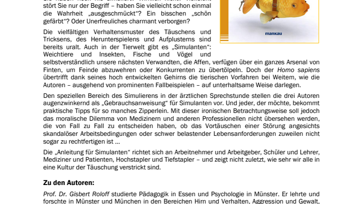Sie haben noch nie simuliert? Wirklich nicht? Die verschiedenen Methoden des Täuschens und Tricksens, des Herunterspielens und Aufplusterns sind bereits uralt und auch in der Tierwelt weit verbreitet. Doch der Homo sapiens übertrifft dank seines hoch entwickelten Gehirns die tierischen Vorfahren bei Weitem, wie die drei Autoren auf unterhaltsame Weise darlegen. Den speziellen Bereich des Simulierens in der ärztlichen Sprechstunde stellen sie dabei augenzwinkernd als "Gebrauchsanweisung" für Simulanten vor. Und jeder, der möchte, bekommt praktische Tipps für so manches Zipperlein.