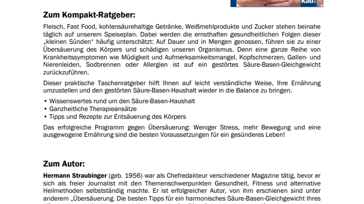 Hermann Straubinger: Säure-Basen-Balance. Kompakt-Ratgeber. Bewährte Tipps und Programme zur Entsäuerung; Mankau Verlag, 1. Aufl. September 2015, Klappenbroschur, 11,5 x 16,5 cm, durchgehend farbig, 127 Seiten, 7,99 Euro (D) / 8,20 Euro (A), ISBN 978-3-86374-255-3