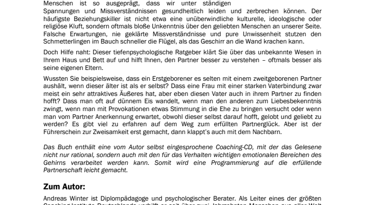 Der neue Ratgeber von Andreas Winter ist die überarbeitete und in wesentlichen Teilen ergänzte Fassung seines Buches "Liebe, Sex und Partnerschaft – Warum Erfüllung so einfach sein kann!" aus dem Jahr 2008. Es wendet sich an Eheleute, Singles und Geschiedene, ebenso wie an Teenies und Senioren, Schwule, Lesben, Heteros und Selbstmacher. Wie man es von dem Bestseller-Autor und erfolgreichen Leiter eines Coaching Instituts erwartet, ist es ernst und humorvoll, differenziert und plakativ. Darüber hinaus enthält es außerdem eine CD mit einem tiefenpsychologischen Coaching-Programm, mit dem sogar ein paar der möglicherweise bislang nicht bewussten Eigenschaften entdeckt und ergründet werden können. Damit soll es den Lesern gelingen, die eigene Selbstsicherheit und damit auch Liebesfähigkeit etwas zu verstärken. Wer wissen will, was genau hinter Einsamkeit und Beziehungsstress steckt und wie man diese dennoch überwindet, wenn man Spaß an tiefenpsychologischer Detektivarbeit hat und offen für ungewöhnliche Sichtweisen ist, dann ist dieses Buch genau das Richtige. Denn klappt’s in der Liebe, klappt’s meist auch im Leben.