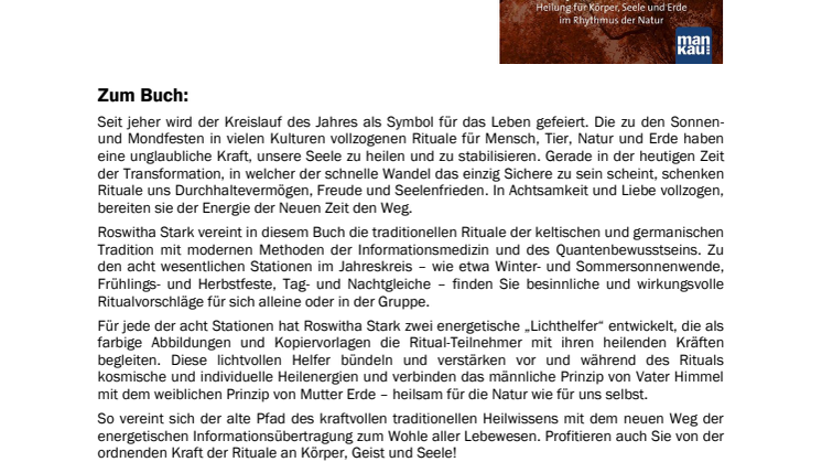 Roswitha Stark: Rituale im Jahreskreis. Heilung für Körper, Seele und Erde im Rhythmus der Natur. Mankau Verlag, 1. Aufl. Okt. 2014, Hardcover, farbig, 15 x 21,5 cm, 223 Seiten, 17,95 Euro (D) / 18,50 Euro (A), ISBN 978-3-86374-168-6.