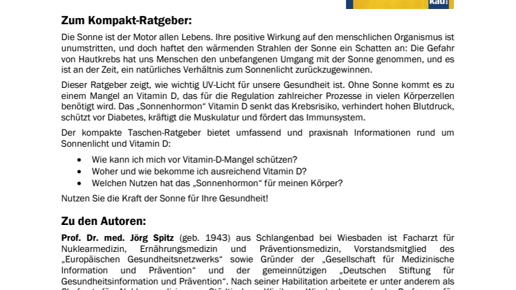 Prof. Dr. med. Jörg Spitz / William B. Grant, Ph. D.: Vitamin D - Das Sonnenhormon. Kompakt-Ratgeber. - Warum die Sonne so wichtig für uns ist. - Wie Sie Ihren Vitamin-D-Vorrat auftanken. Mankau Verlag 2014, 1. Aufl. Nov. 2014, Klappenbroschur, 11,5 x 16,5 cm, durchgehend farbig, 95 S., 7,99 Euro (D) / 8,20 Euro (A), ISBN 978-3-86374-178-5.