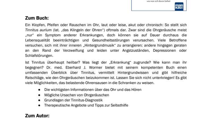Dr. med. Eberhard J. Wormer: Tinnitus. Wie Ohrgeräusche entstehen und wie man sich davon befreit. Mankau Verlag 2015, Klappenbroschur, zweifarbig, 16 x 22,4 cm, 190 Seiten, 14,95 Euro (D) / 15,40 Euro (A), ISBN 978-3-86374-218-8.